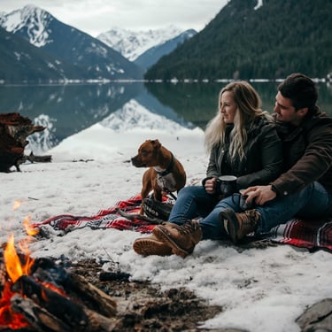 A campfire by a beautiful lake or river